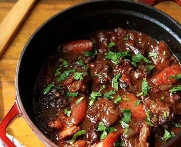 牛尾;胡萝卜半根;洋葱半个;小土豆1个;红酒1大杯;李锦记黑胡椒酱1大勺;生抽1大勺;盐少许;糖少许;姜几片